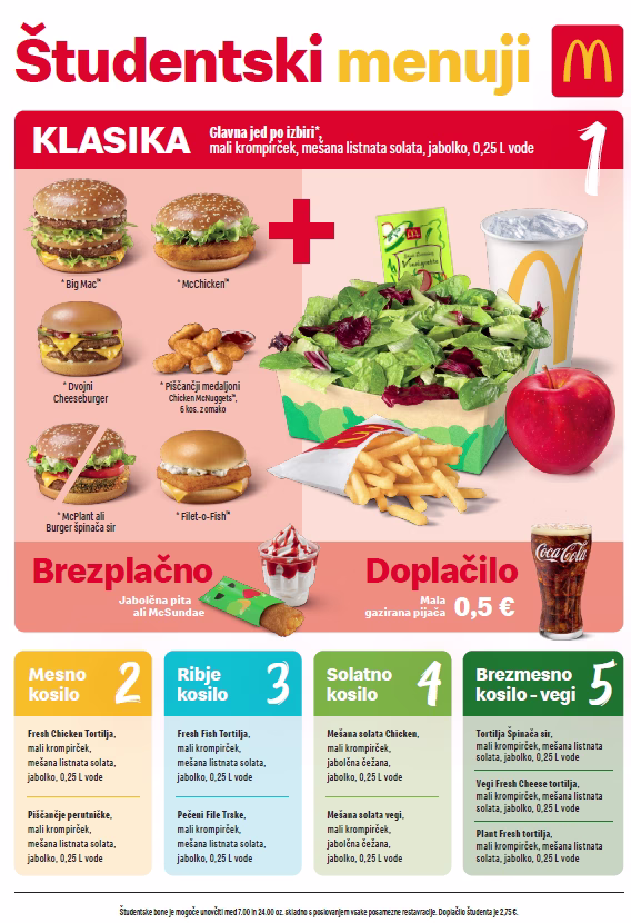 Doplačilo za študentski obrok znaša le 2,75 evra, kar McDonald’s uvršča med cenovno najugodnejše ponudnike študentske prehrane.